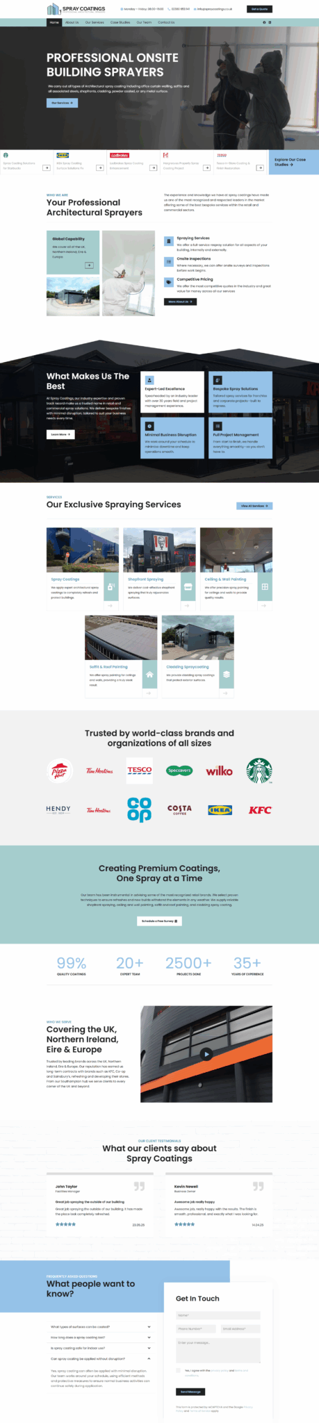 e’ve crafted a professional, future-ready website for Spray Coatings—specialists in onsite architectural spray finishes for commercial and retail environments across the UK, Ireland, and Europe. Built to spotlight their expertise in shopfront spraying, cladding re-coating, soffit and roof painting, and precision ceiling & wall finishes, the site reflects a business defined by quality workmanship, minimal disruption, and results that elevate every building.